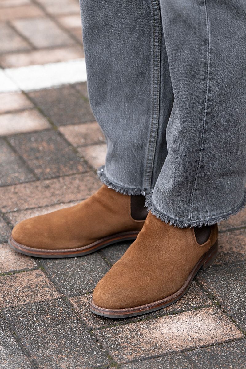 ▶︎水本さんのスナップをすべて見る水本 修さん(48歳)ボタンのデザインがアイコニックなベージュのサファリジャケット。その相棒に抜擢したのがリーバイスのブラックデニムだ。ほぼグレーまで色落ちしたストレートタイプで、カットオフした裾も含め、かなりこなれている。