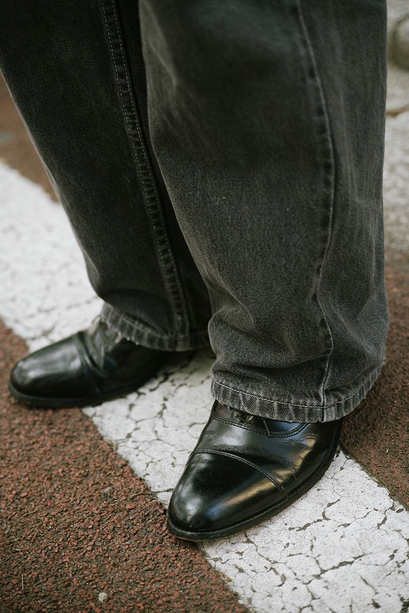 ジャケット、Tシャツ、靴=ともに古着 デニム=リーバイス 眼鏡= ジャックデュラン バッグ=不明