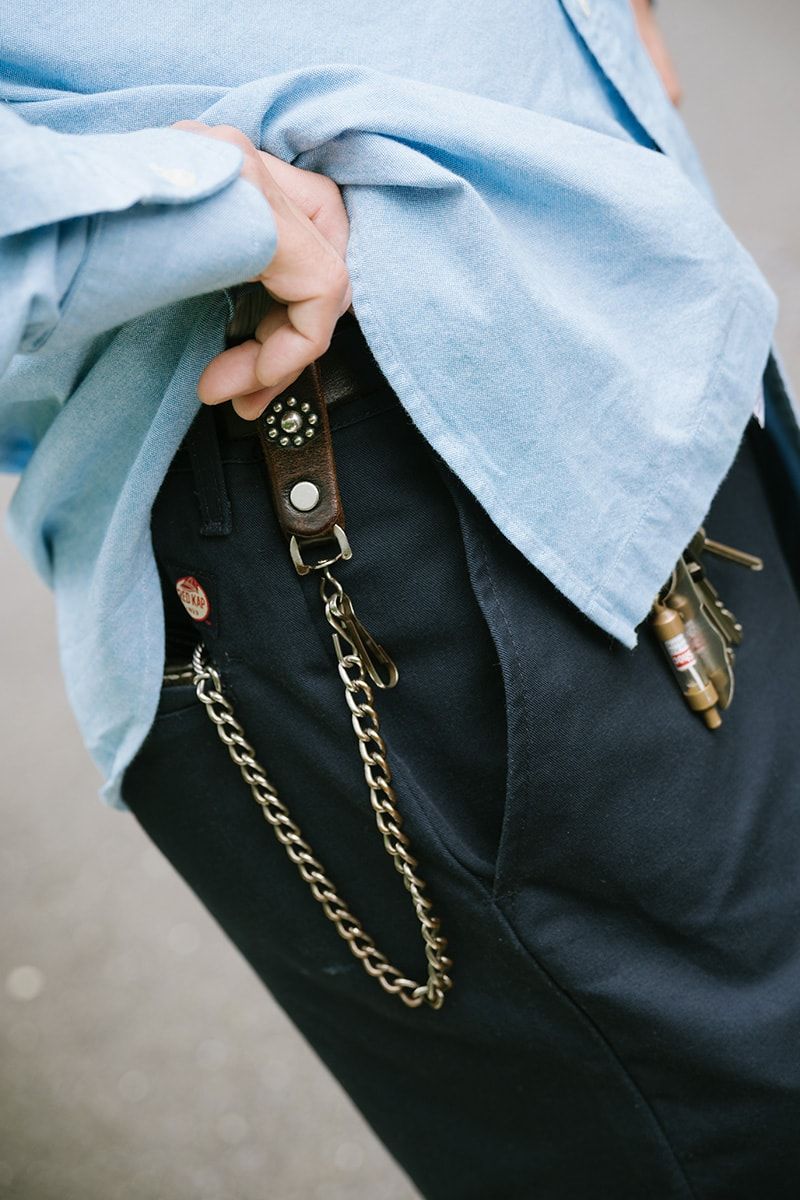 武骨なウォレットチェーンや、イエローのニットキャップでアクセントをプラスし、単調見えを華麗に回避。お見事!