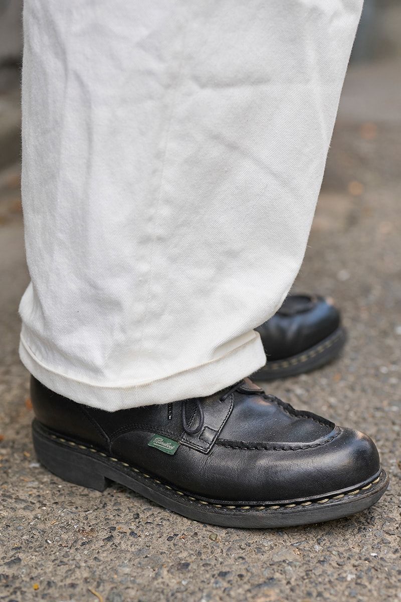さらにパラブーツの革靴、ダニエル&ボブのレザーバッグを合わせて大人の品格を強化。袖、裾はさくっとまくってヌケへの配慮も欠かさない。巧い。