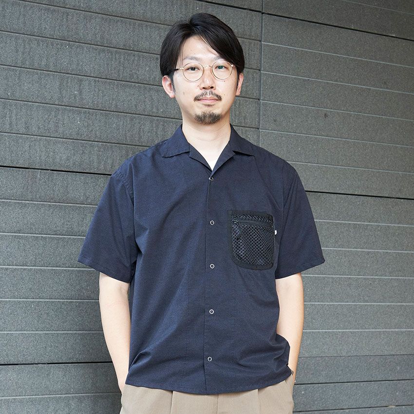 シャツ=メローピープル パンツ=トラディショナルウェザーウェア シューズ=ホカ 眼鏡=アヤメ バングル=古着