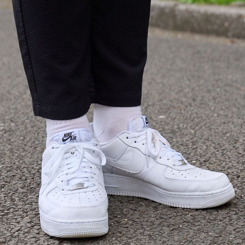 シューレースもソールも真っ白なエア フォース 1が、潔いコントラストを演出。ソックスも白で揃えて、シンプルスタイルを徹底している。