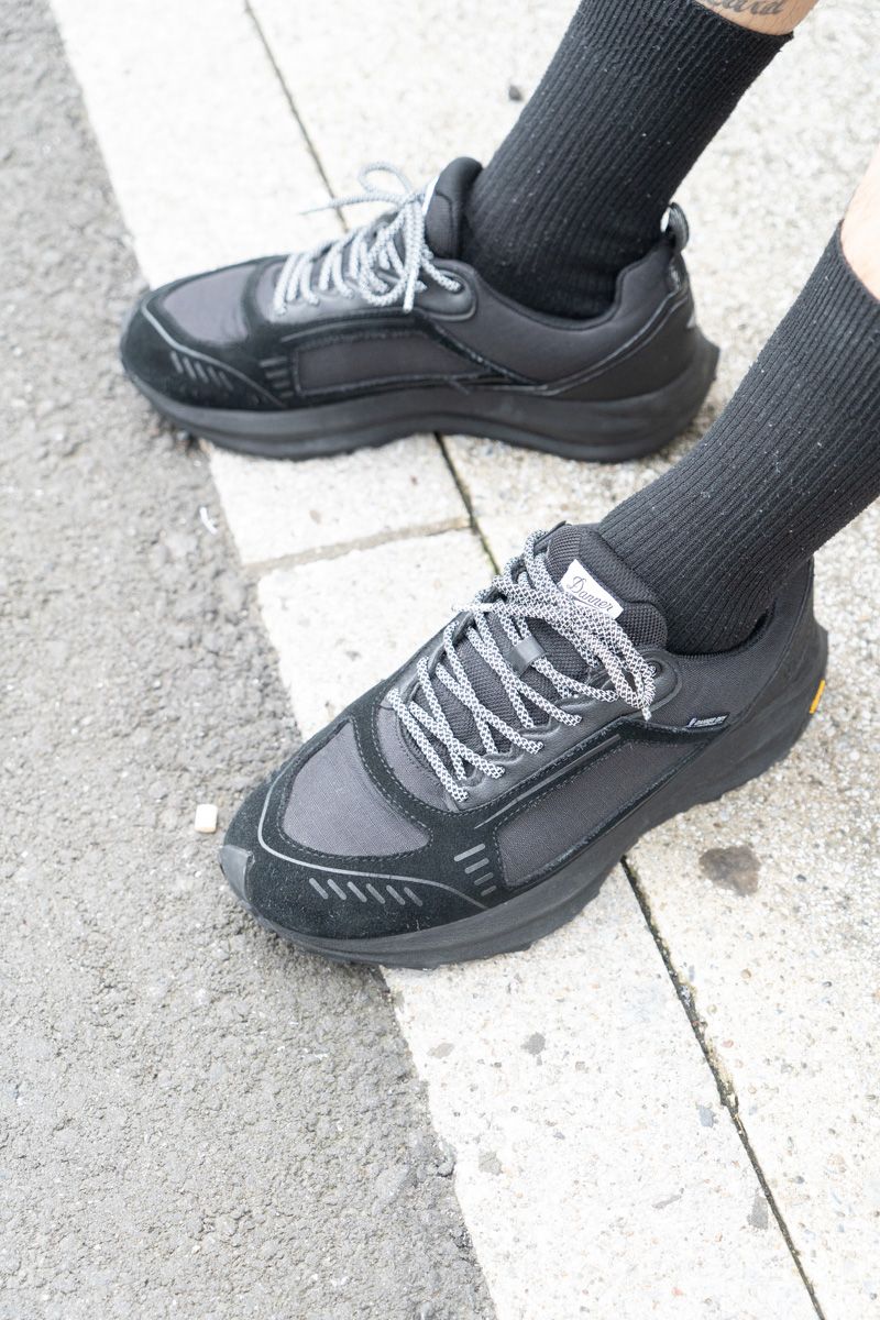 ハットとバッグはサファリライクなテイストで揃えて、足元は黒で引き締め。ボリューミーなスニーカーは、ショーツとの相性も抜群だ。