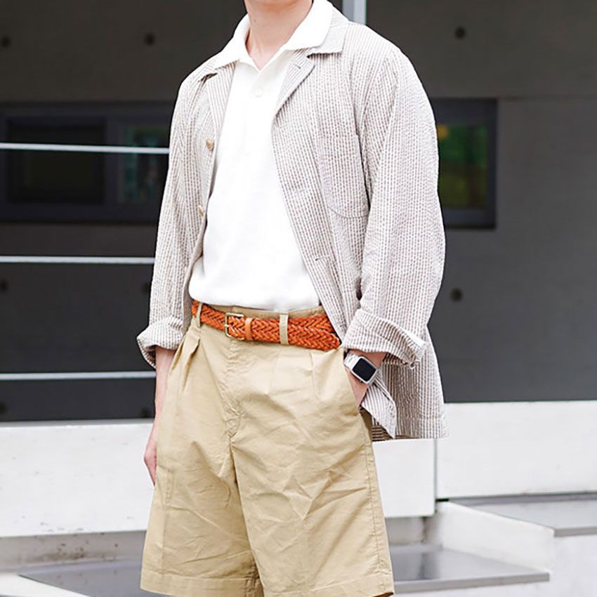 ジャケット、ポロシャツ、ショーツ、ベルト=すべてバストン シューズ=バーウィック 腕時計=アップル 眼鏡=ジュリアスタートオプティカル