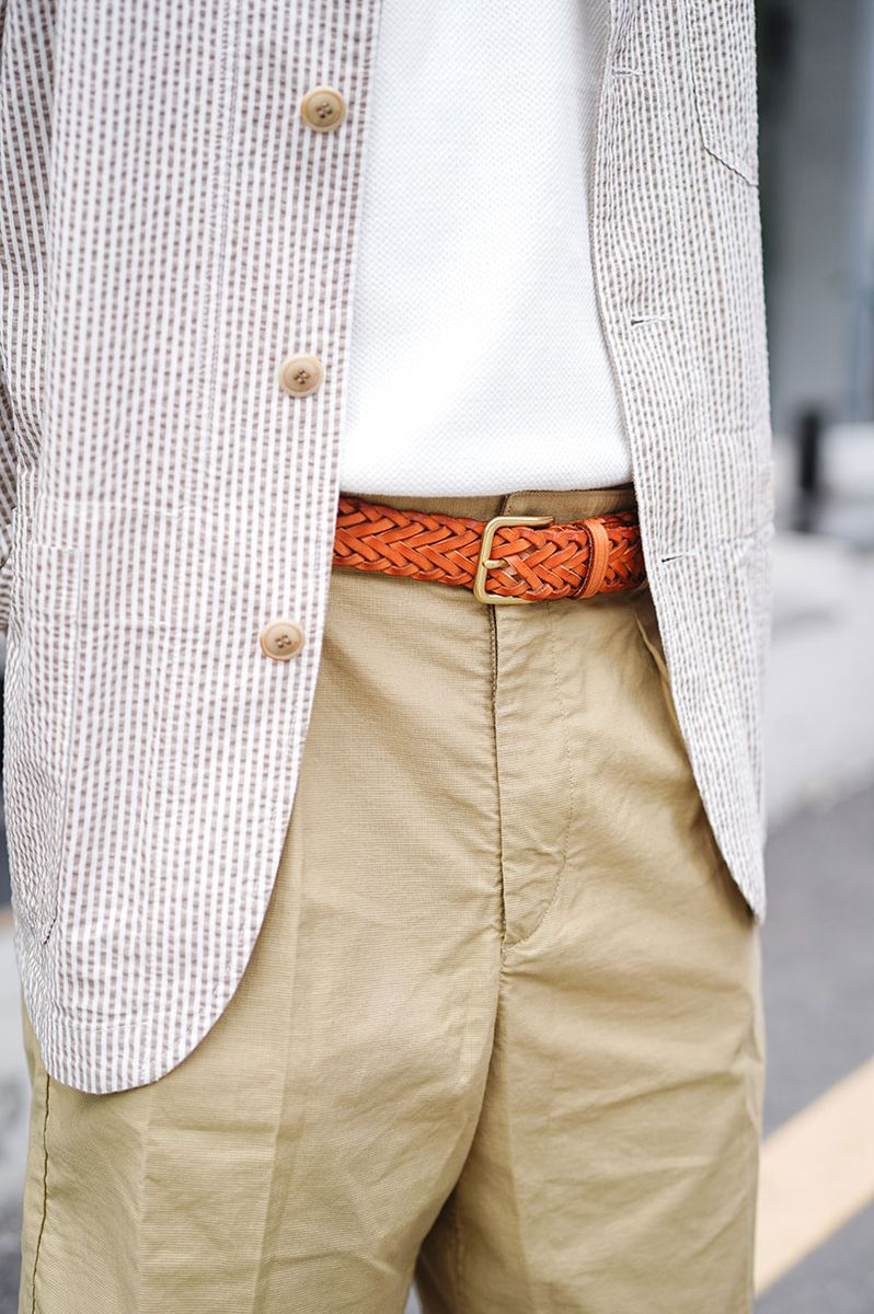 ▶︎クォンさんのスナップをすべて見るクォン・スンチャンさん (26歳)撮られ慣れたポージングはさることながら、シアサッカー地のサマージャケットが軽やかで上品。ストライプの白と茶を全身で拾い上げ、まとまりの良さも抜群だ。
