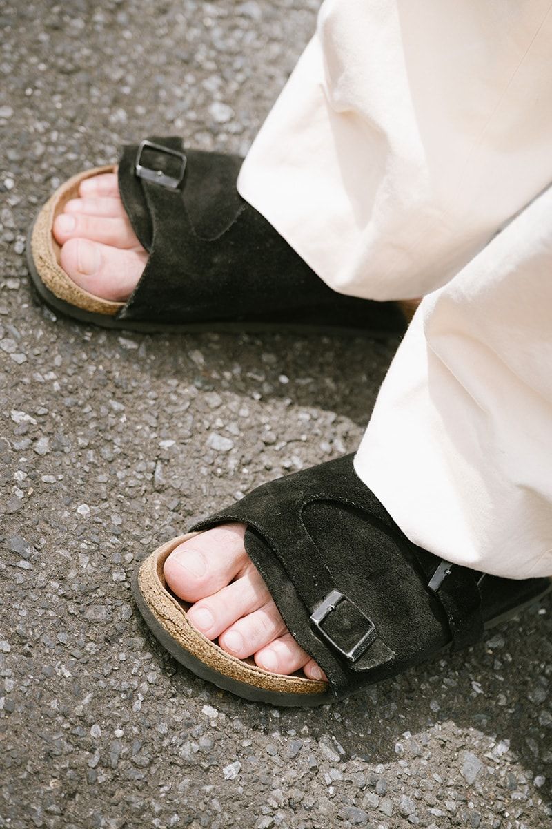 最後はビルケンシュトックの名作「チューリッヒ」の黒で、装いを程良く引き締めた。