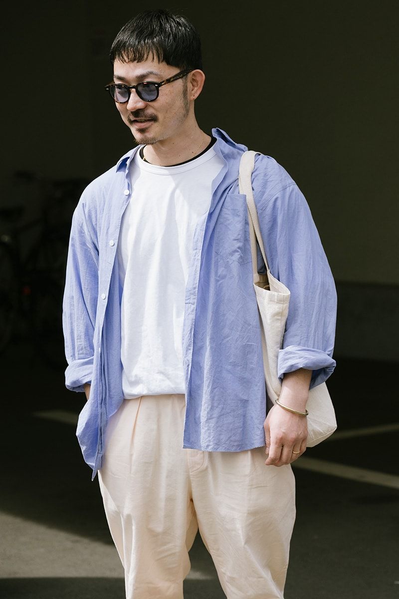▶︎成さんのスナップをすべて見る成 雄大さん(39歳)「コム デ ギャルソン」の白Tに、「コモリ」のリラックスシャツをゆったり羽織る。肩の力が抜けていながら、品の良さはしっかり担保されている。ベージュの「ニート」パンツで全体に柔らかなトーンを添え、軽やかで涼しげなスタイルに。