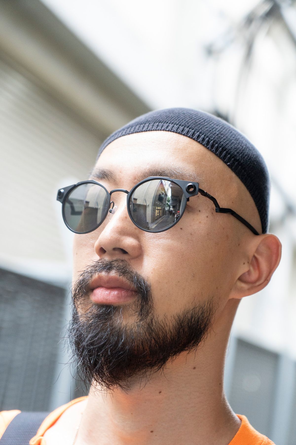 色味とシルエットで遊んだ上出さんのスタイルにおいても、目元の存在感は格別。ニットキャップやバッグと黒で合わせて、全体の印象を落ち着かせる点でも有益だ。