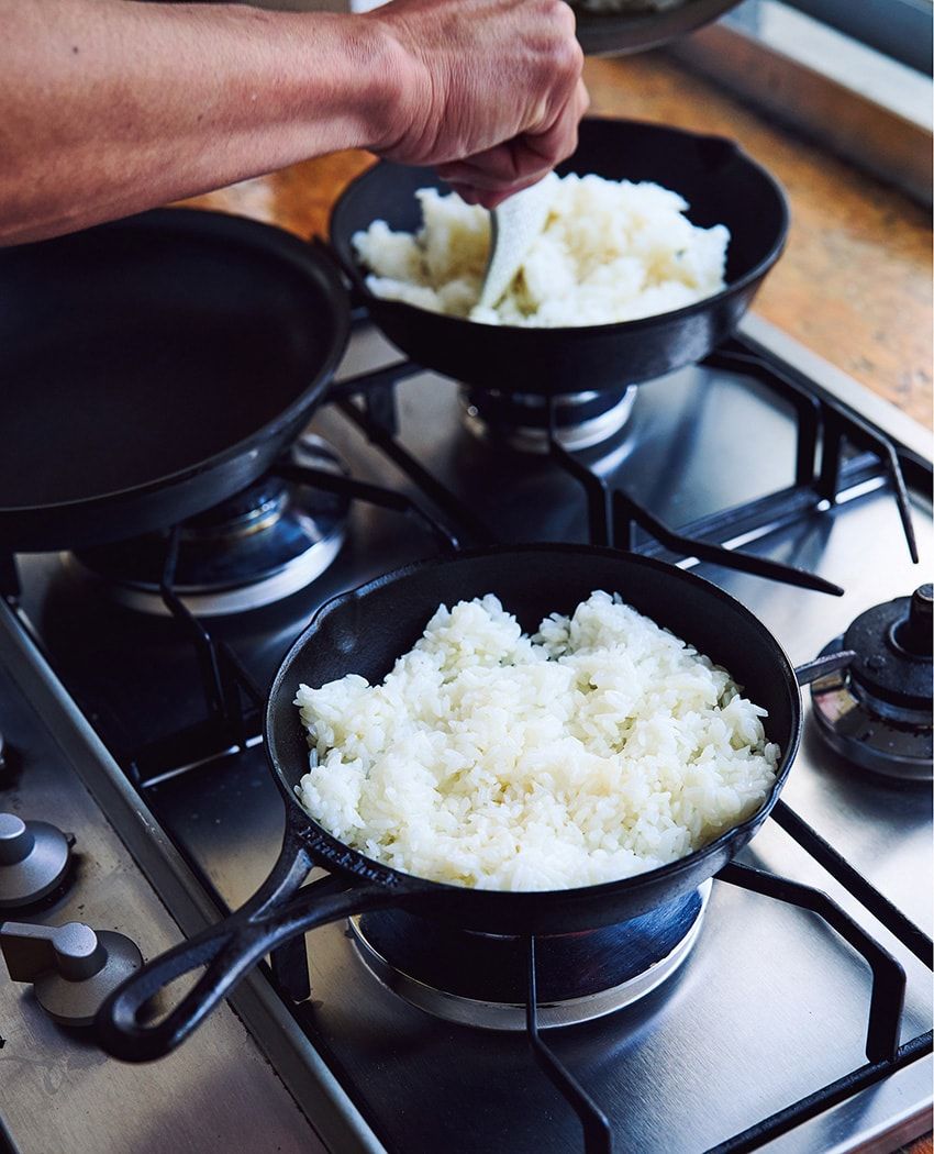 ⑤ スキレットに④を入れて平らにならし、中火にかけて焦げ目がつくまで焼く。