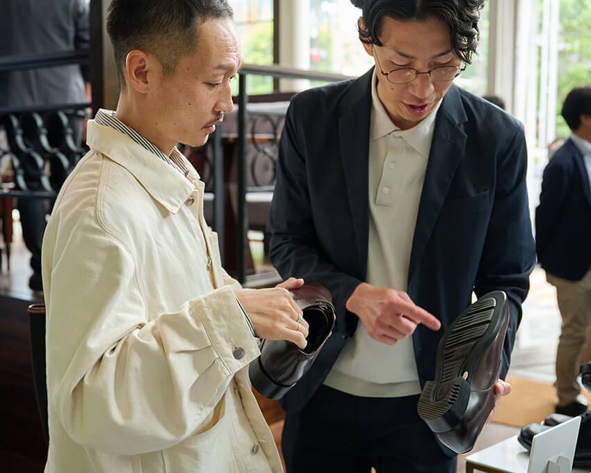 プロの視点からマンツーマンで靴選びが学べるまたとないチャンスとあって、参加者も興味津々。参加者の一人であるサカイタカシさんは、「ソールのクッションがすごく柔らかくて驚きました。何より軽い。普段はイギリスの老舗ブランドの昔ながらの革靴を履いているのですが、比較にならないくらい履き心地がいいです。平日のスーツスタイルもそうですが、今日のようなデニムスタイルにも相性良さそうですね」と感動の様子であった。