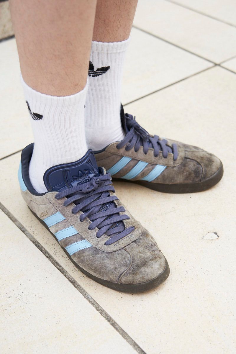 ▶ゆうさんのスナップをすべて見るゆうさん(23歳)Tシャツ、ソックス、スニーカーをアディダスで統一。それらに挟まれる形で存在感を発揮するのがグラミチのブルーショーツである。