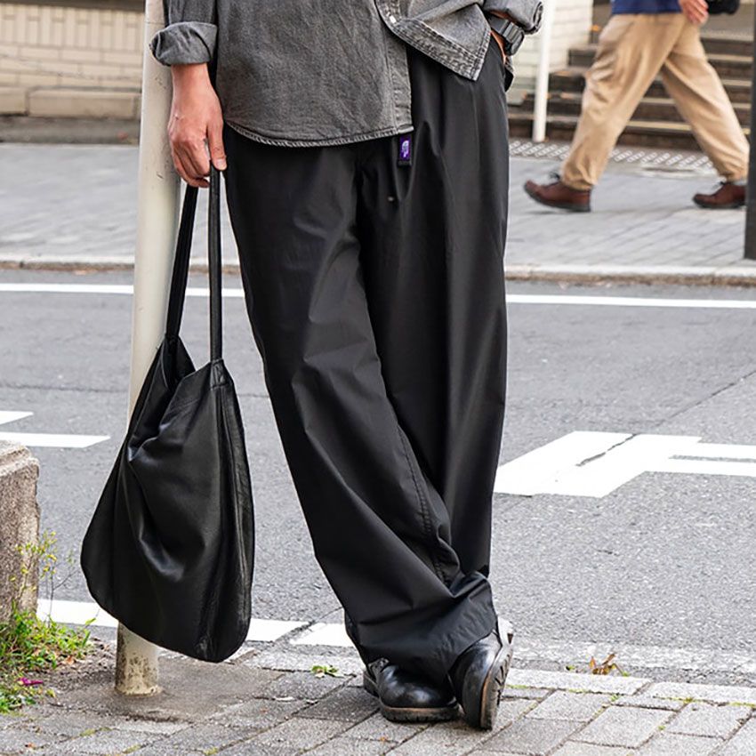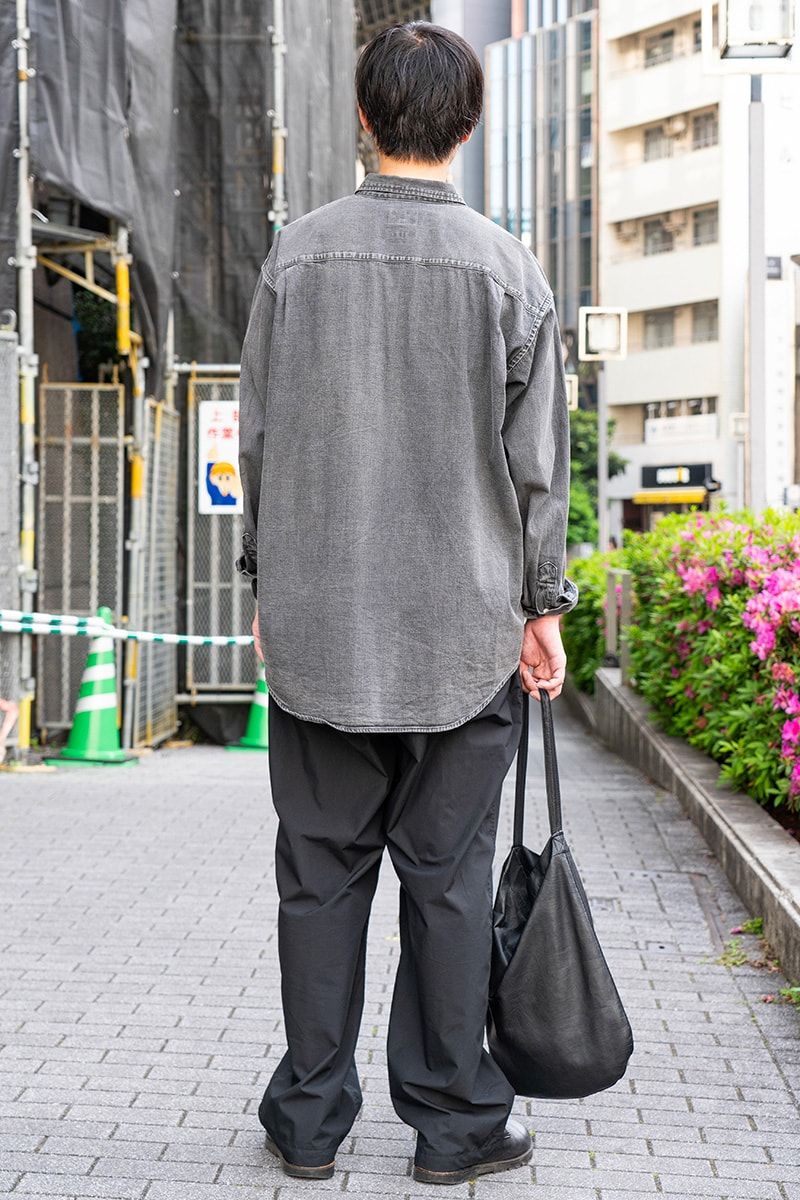 ▶︎山隈さんのスナップをすべて見る山隈 豊さん(33歳)ワイドシルエットとドレープがサマになるナイロンパンツを軸に、立体感のあるオールブラックを形成。ケミカルなパンツとフェードしたデニムシャツの、濃淡の対比が美しい。