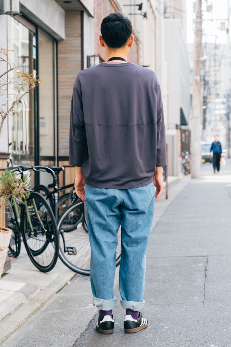 ▶︎渡邉さんのスナップをすべて見る渡邉真吾さん(41歳)首にかけたバッグで、そしてデニムの腰から伸びるベルトで主張する“パープル”が、同系色をレイヤーしたトップスと共鳴。程よくビッグなシルエットも調子いい。