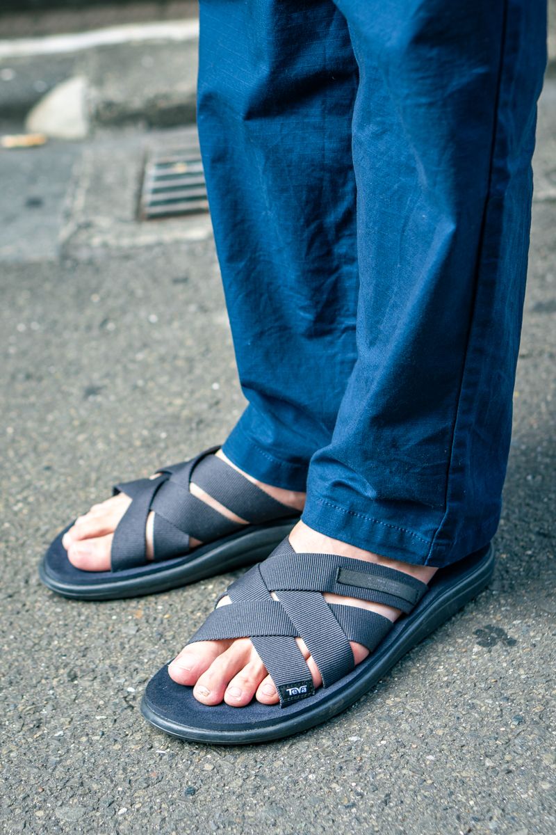 最後にサンダルを履けば、街にもリゾートにも映えるリラックススタイルの完成だ。