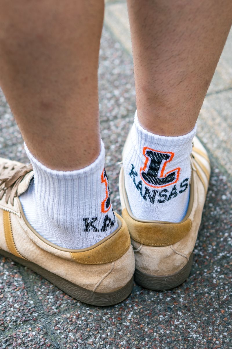 足元は白ソックスを効かせつつ、トーンを合わせて統一感をキープ。派手さはないが、センスフルなコーディネイトだ。