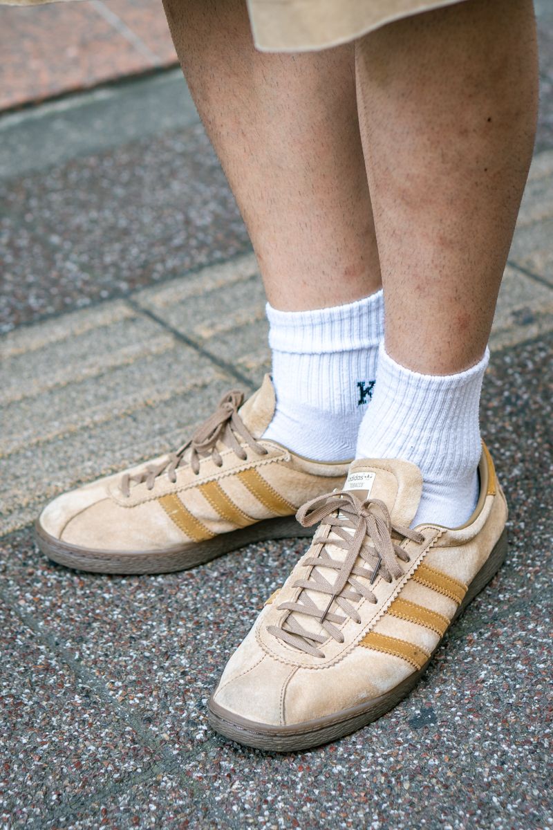 ▶︎木村さんのスナップをすべて見る木村虎之助さん(25歳)淡いベージュの「アディダス タバコ」が、コーデ全体にやわらかな雰囲気を添える。オーバーサイズのストライプシャツと太めのカーゴショーツで、抜け感たっぷりのスタイルに。