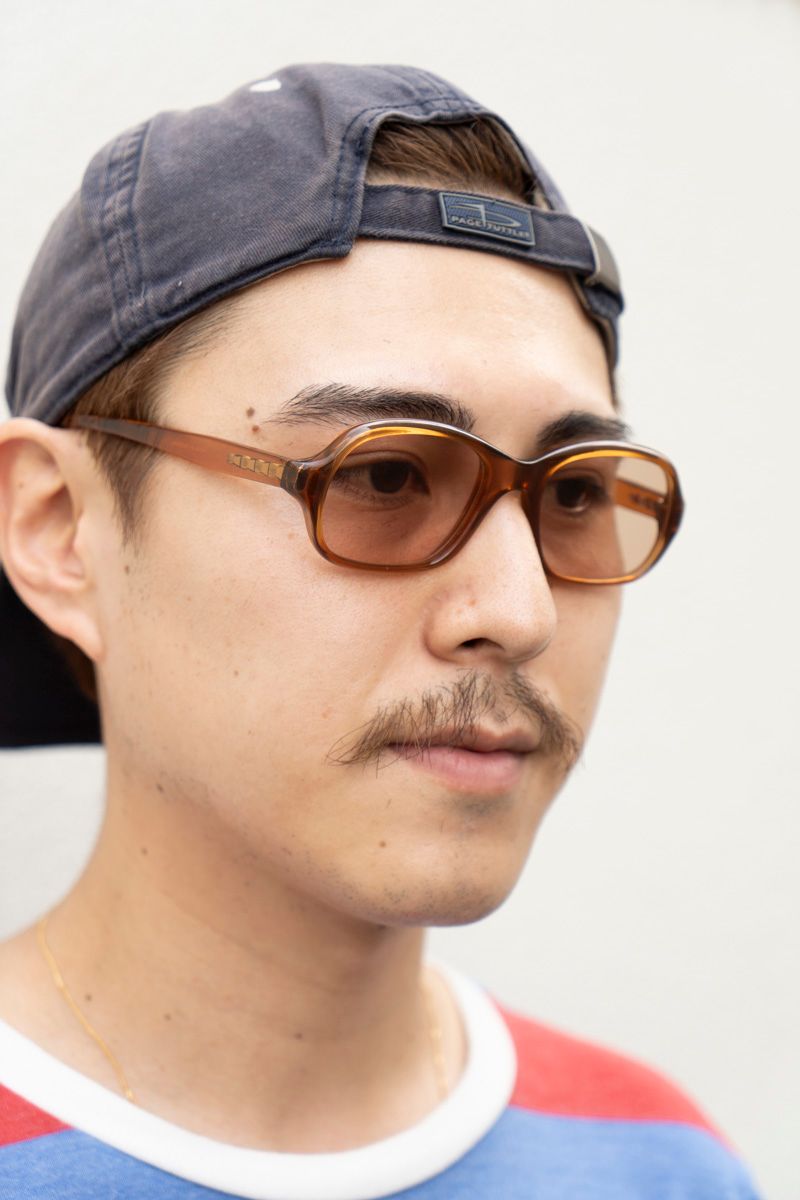 Tシャツ、帽子=ともに古着 パンツ=ユナイテッドアローズ&サンズ 眼鏡=ヴィンテージ ネックレス=ノーブランド リング=トムウッド ベルト=ジェイアンドエムデヴィッドソン