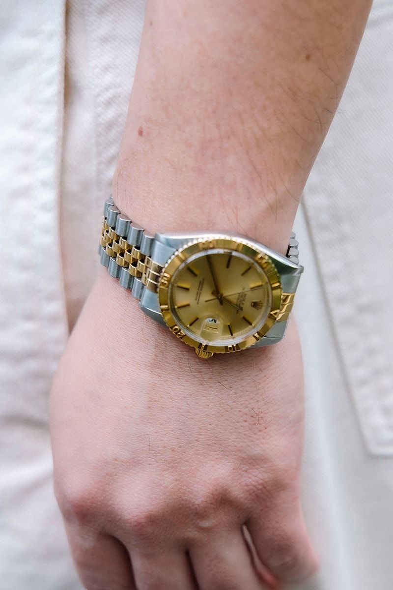 Tシャツ=オーラリー パンツ、バッグ=ともにルメール 靴=プラダ 帽子=ラカル サングラス=ユウイチトヤマ 腕時計=ロレックス