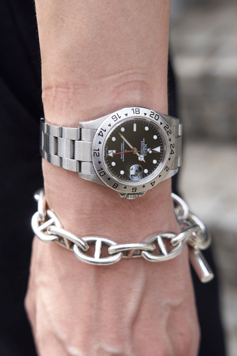 Tシャツ=エイチアンドエム パンツ=ジーユー シューズ=リーボック×メゾンマルジェラ 眼鏡=イジピジ バッグ=フィルザビル 腕時計=ロレックス ブレスレット=エルメス リング=クロムハーツ