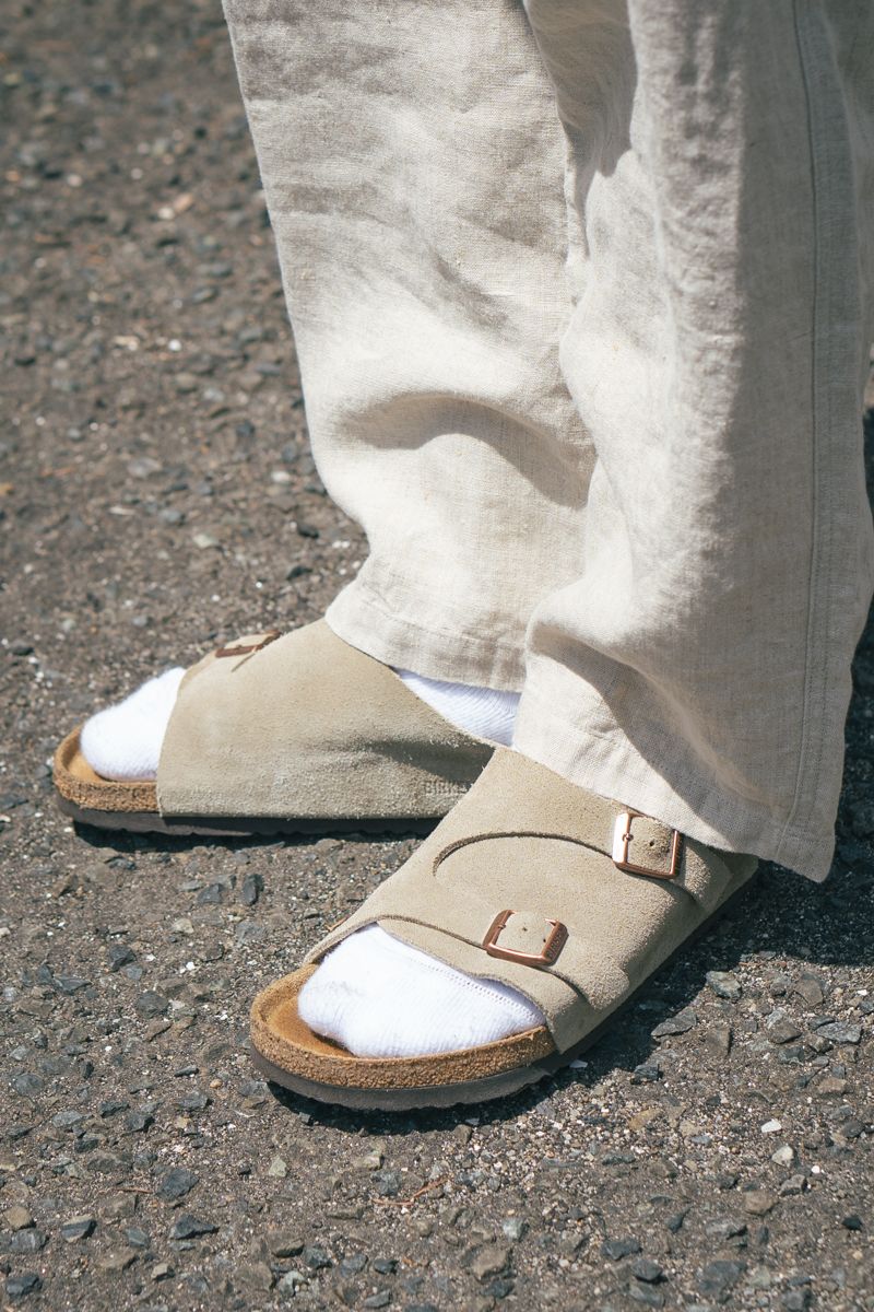 柔らかなベージュ&ホワイトの色合い、さらにはソックス併用のビルケンでも開放感と品の良さを両立。クラウンパントゥ型のサングラスは、夏の光をモダンに跳ね返す。