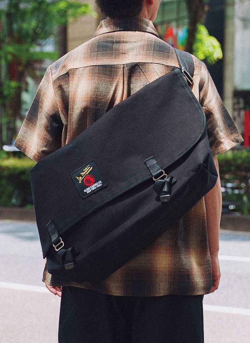 佐々木詩以良さん / 44歳トップボタンまで留めたチェックシャツと、メッセンジャーバッグという西海岸風のスタイルには、極太パンツが良く似合う。