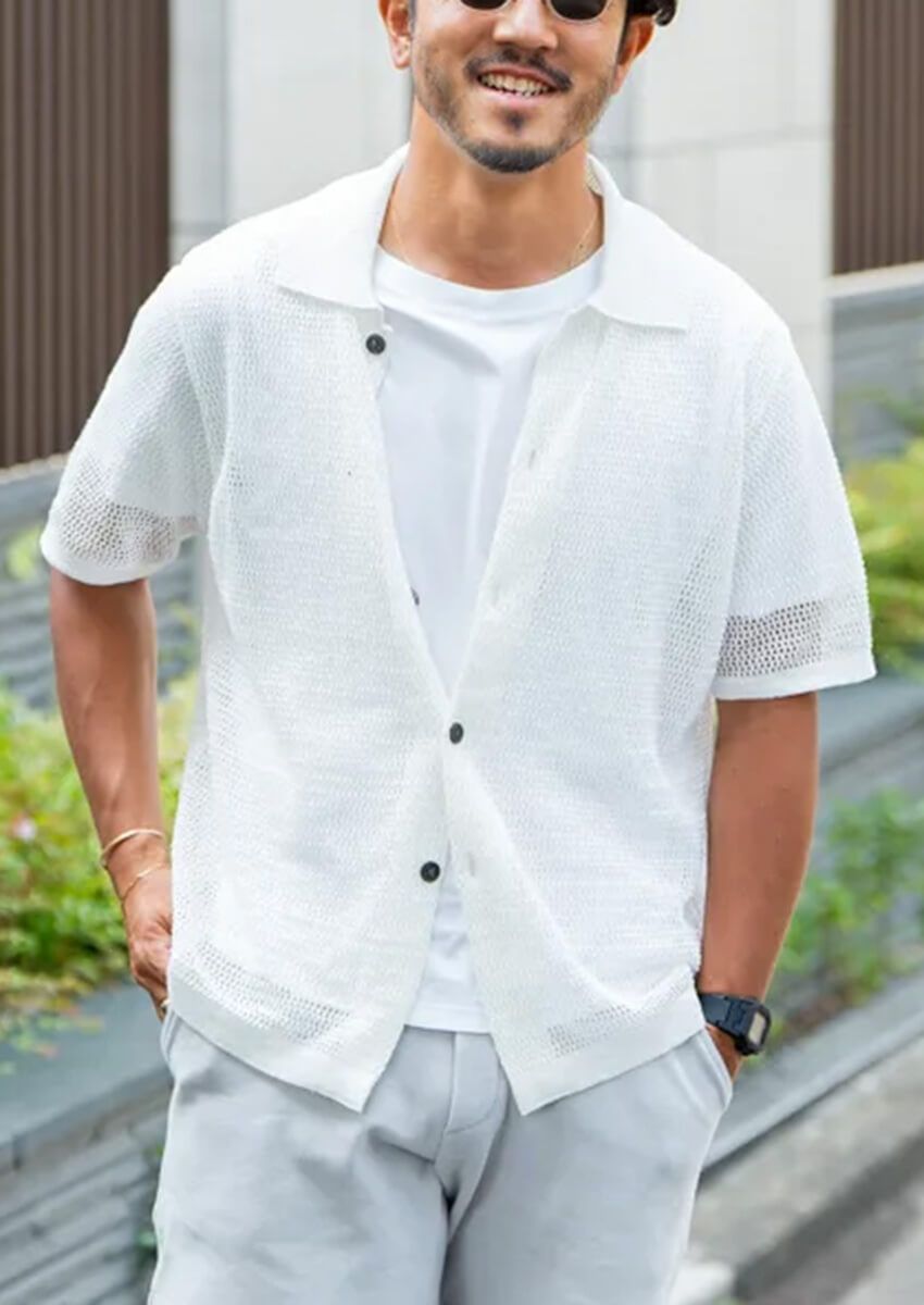 ▶︎岩谷さんのスナップをすべて見る岩谷一樹さん(43歳)白シャツならばこう着たい!そう思わせてくれる岩谷さんのコーディネイト。透け感のあるざっくり編みのシャツに軽快な膝上ショーツを合わせて、足元にはサンダル&目元にはクリアフレームのサングラス。この脱力感が抜群に洒落ている。
