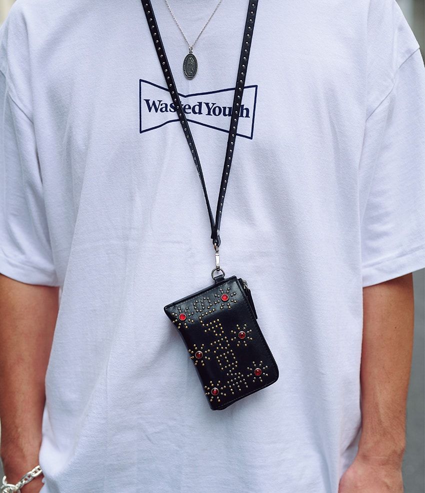 西原陽介さん / 42歳ロゴをスタッズで象ったウォレットは首から提げるだけで、ボックスロゴよろしくTシャツ姿に華を添える。モノトーンコーデのスパイスに。