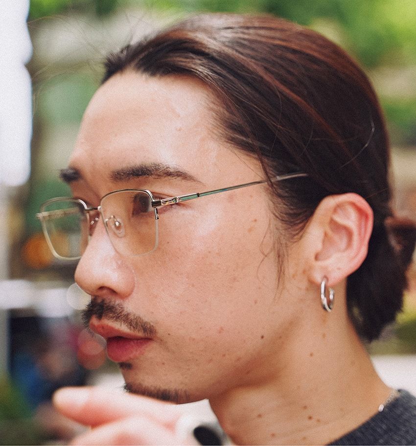 大江飛羽さん / 30歳ミニマルなモノトーンの装いにハーフリムのアイウェア。装飾を極力削ぎ落としたどこかモードな佇まいは逆説的に強い個性となっている。