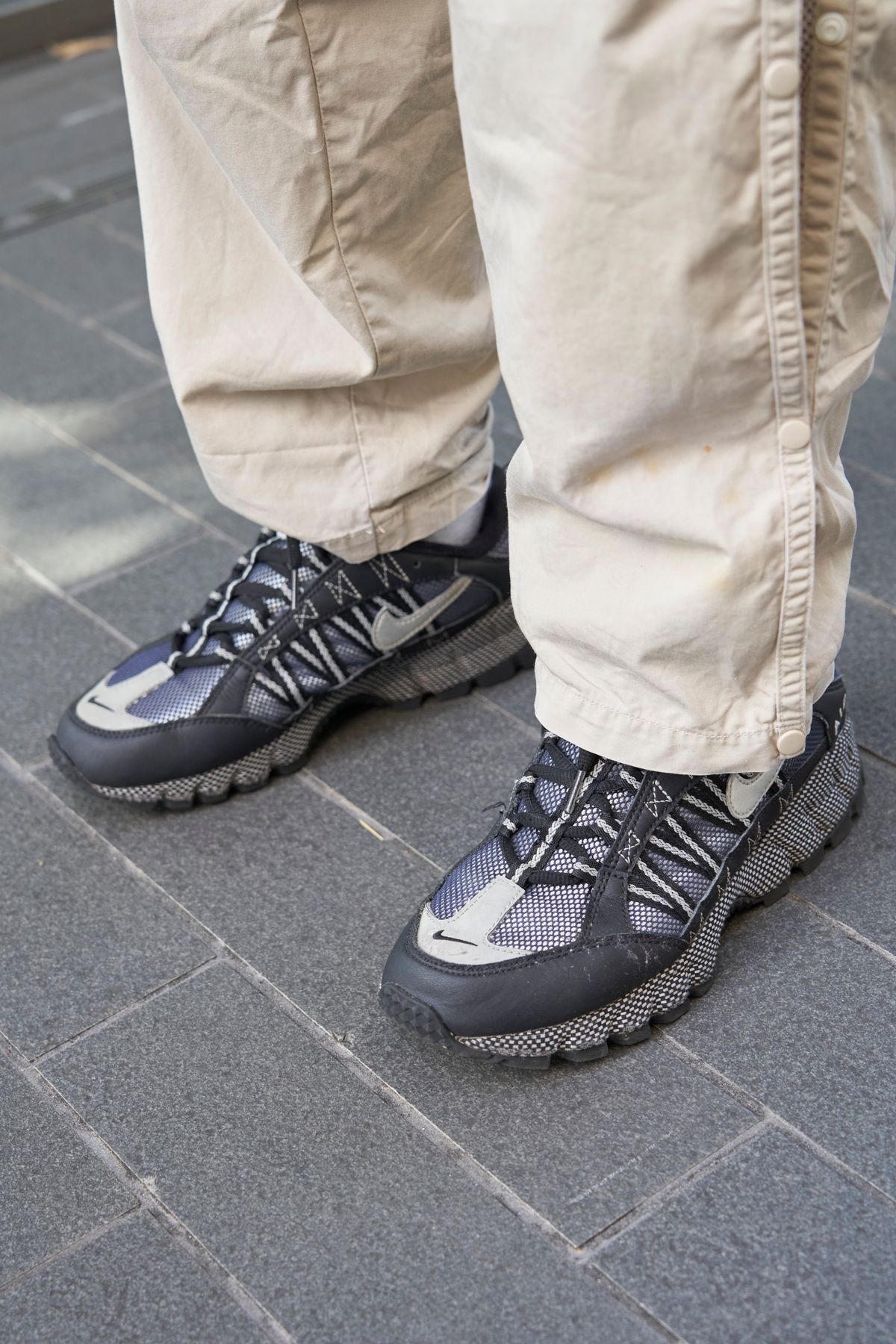 シャツ=タイシノブクニ パンツ=グッドイナフ シューズ=ナイキ 帽子=ステューシー バッグ=トゥミ