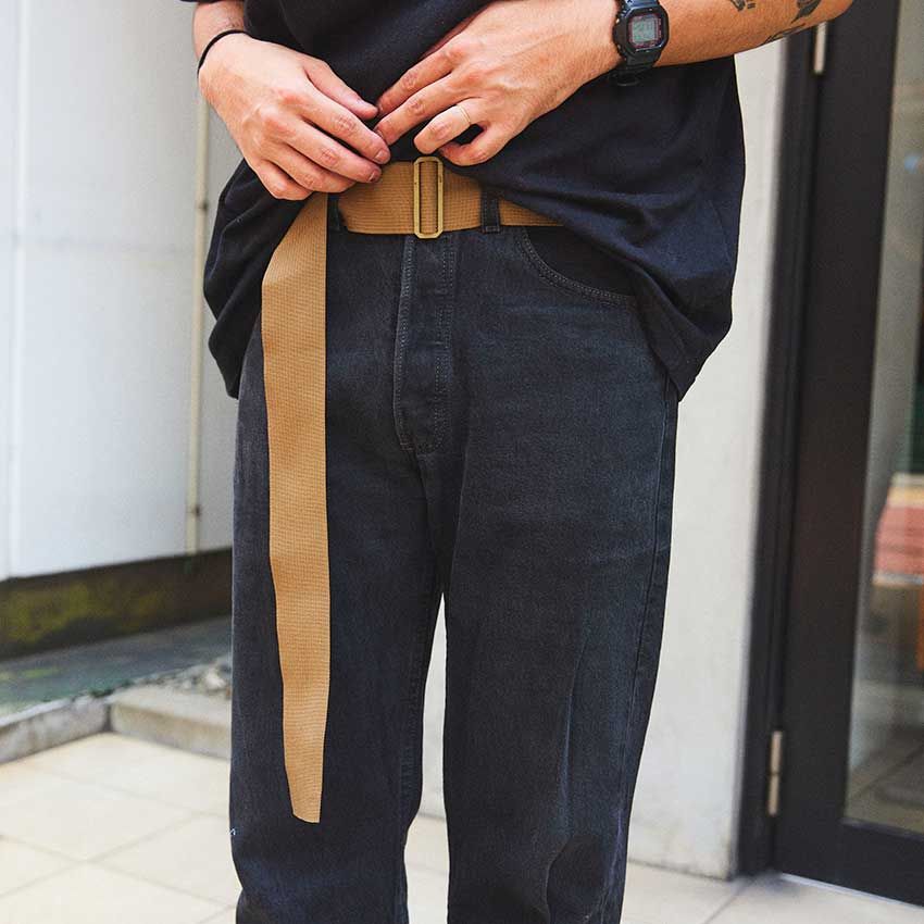 ベルトはなんと、ミリタリーバッグのストラップをリメイクしたもの。ブラウンの挿し色が、ワントーンコーデに絶妙なメリハリを加えている。