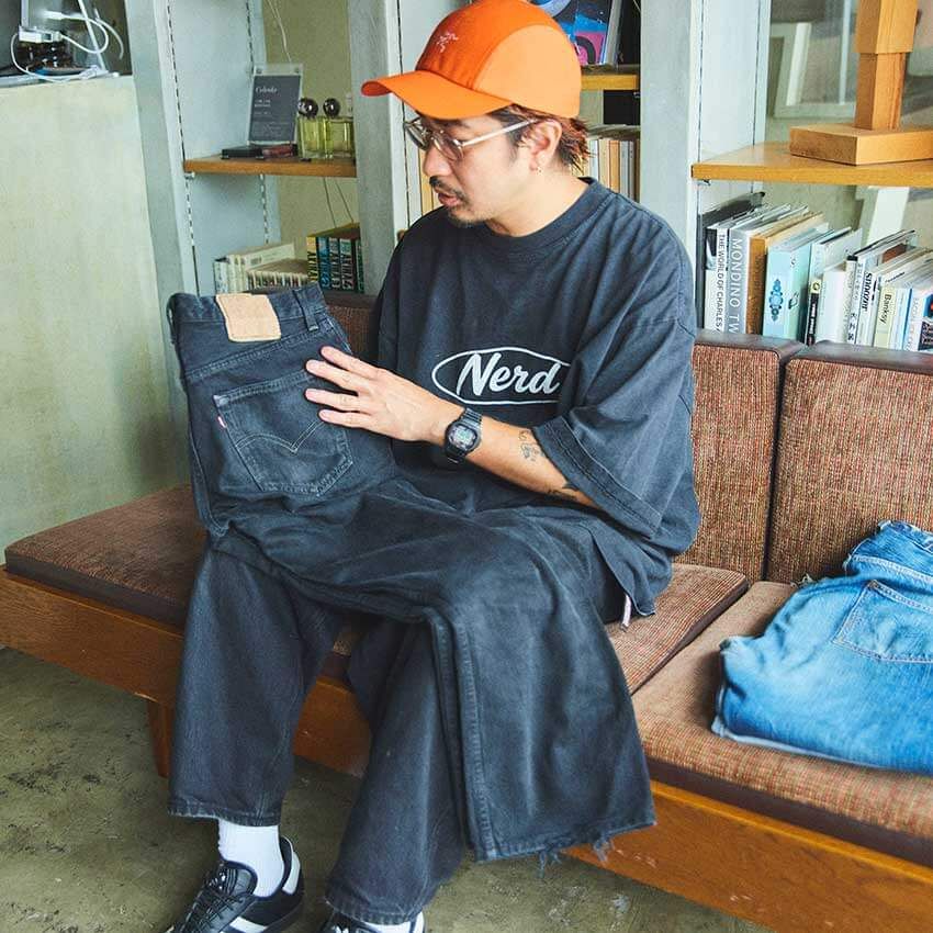 「Tシャツは知人のブランド。シンプルだけど抜け感のあるデザインがいいなと思って。ブラックデニムって、裾が溜まるとちょっと野暮ったく見えるので、少し短めがバランス良く見える。古着だけど、いかにも古着って感じになりすぎないように意識してます」。