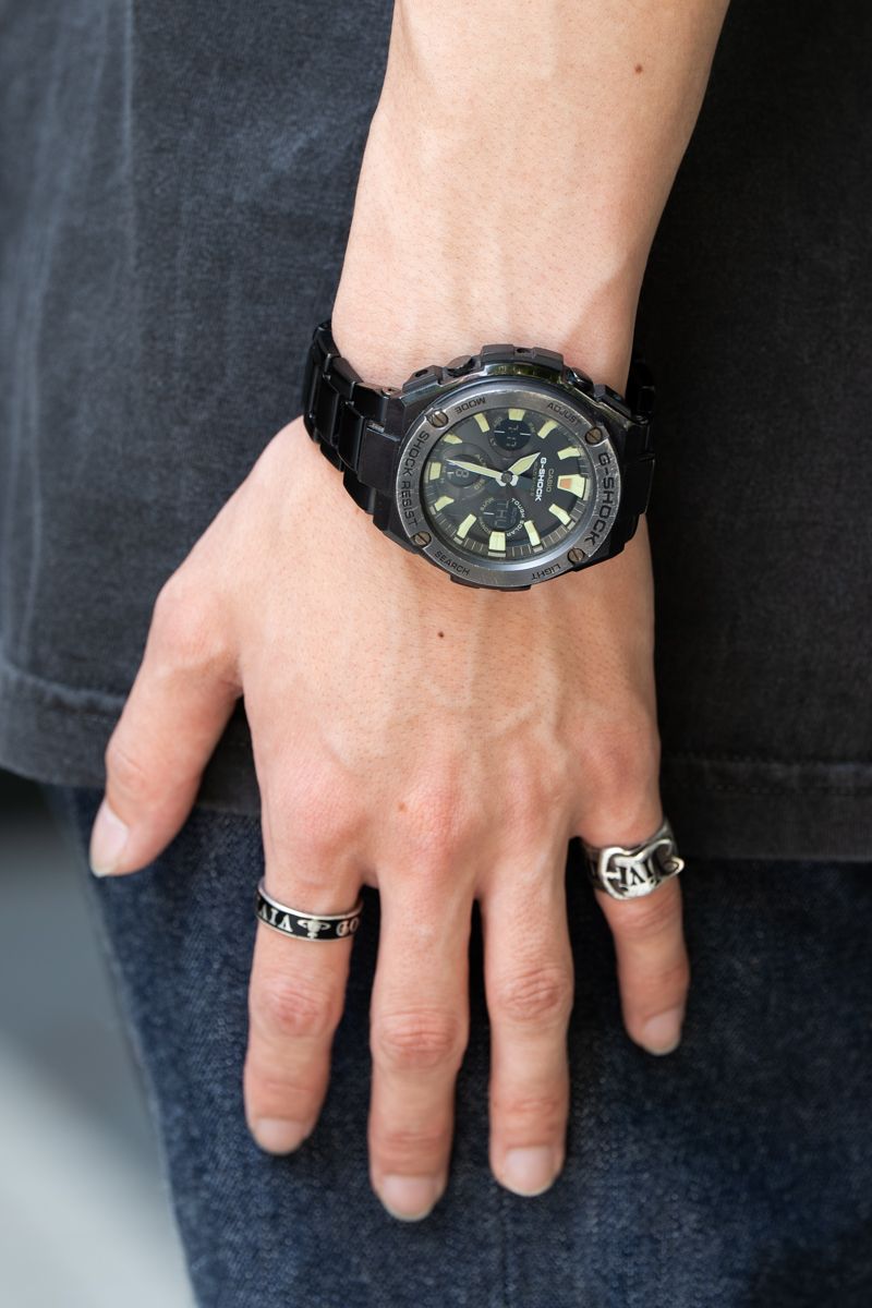 Tシャツ=インディアンモーターサイクル デニム=リゾルト シューズ=ヴァンズ 帽子=ニューエラ 腕時計=カシオ リング=ヴィヴィアンウエストウッド