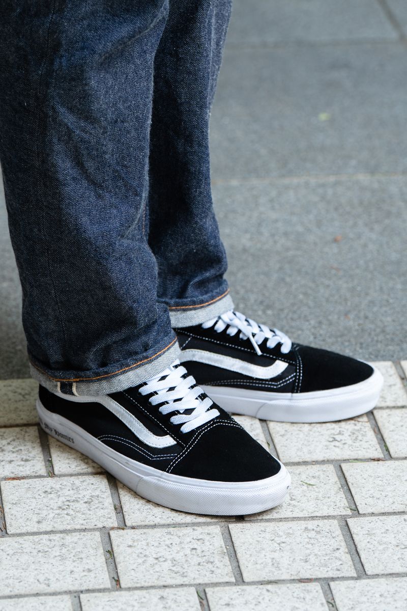 ▶︎髙橋さんのスナップをすべて見る髙橋晃麻さん(25歳)やや細身のインディゴデニムを、黒のオールドスクールと。一見はフツウだけど(もちろんいい意味で)、裾のワンロールアップが地味に効いている。