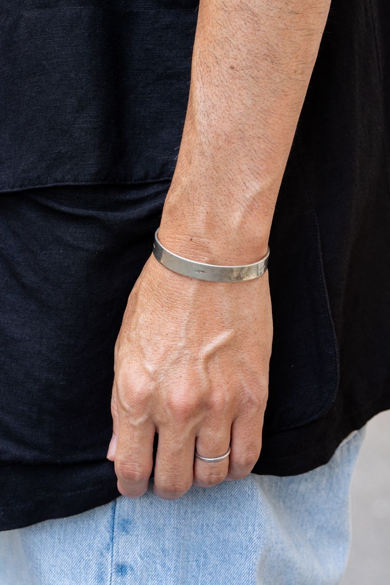 ベスト、デニム=ともにコモリ Tシャツ=フジトスケートボーディング シューズ=コンズ バングル=フジト