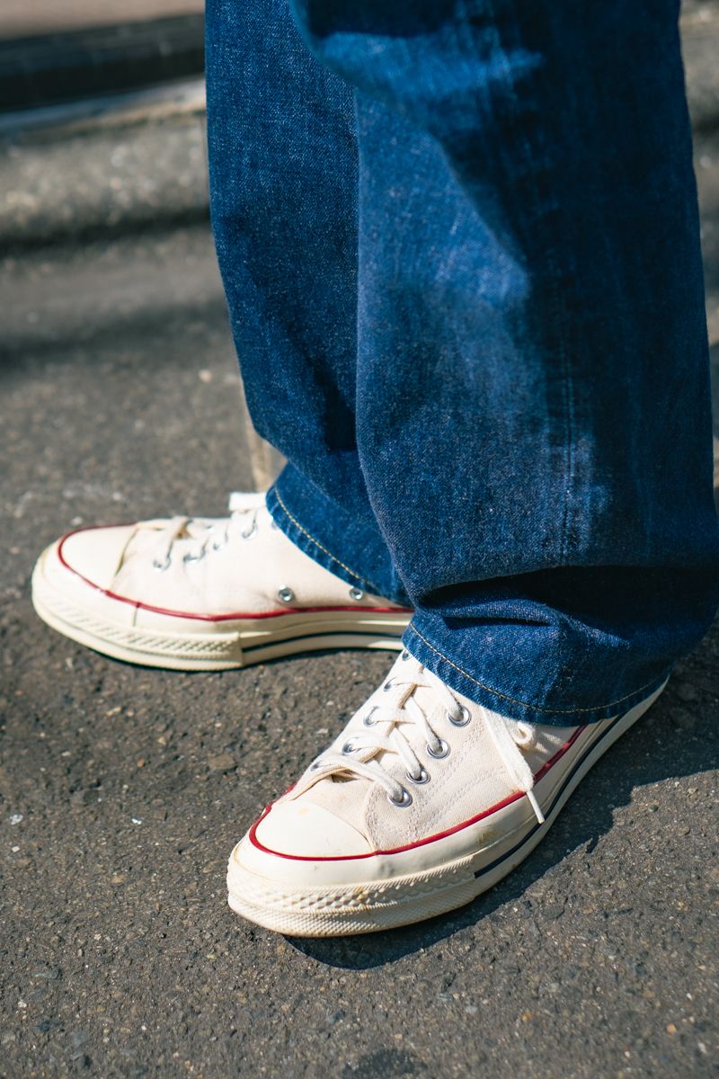 ▶︎恭平さんのスナップをすべて見る恭平さん(44歳)赤ラインがポイントの白コンバース。言うまでもないことだが、ブルーデニムとの相性は間違いない。彼の場合、裾はロールアップせず、溜まりを作ることでリラックス感を演出。アロハシャツ×ストローハットの陽気な気分にマッチさせた、デニムの履き方。そう考えると腑に落ちる。