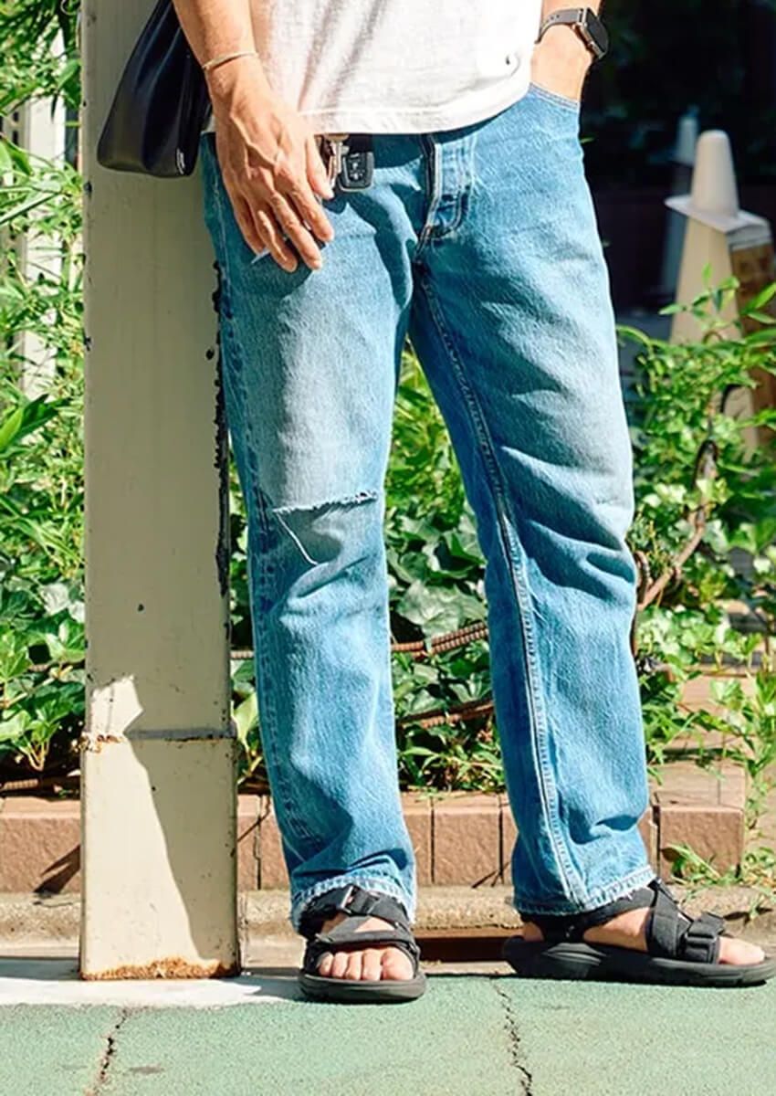 Tシャツ=エルエルビーン デニム=リーバイス サンダル=テバ バッグ=アエタ サングラス=トムフォード 腕時計=アップル