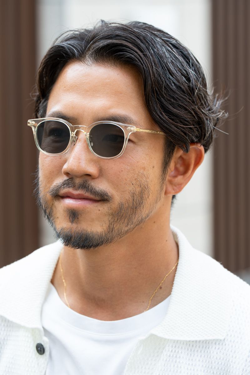 ▶︎岩谷さんのスナップをすべて見る岩谷一樹さん(43歳)透け感のあるざっくり編みの白シャツに膝上丈ショーツを合わせた岩谷さん。足元はサンダル、目元はクリアフレームのアイウェアで軽やかに。上下を白で統一し、涼やかさと大人っぽさを両立した。
