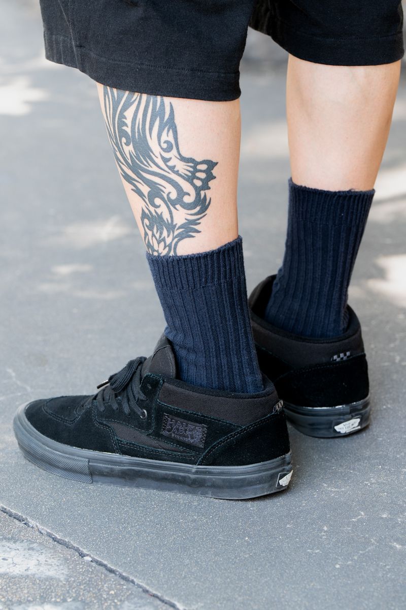 スニーカー、ソックス、ハットもブラックでまとめてソリッドに。黒の無地を徹底したからこそ、白インナーのヌケ感と脚のタトゥーが一層際立つ。“魅せ方”をよくわかっていらっしゃる。