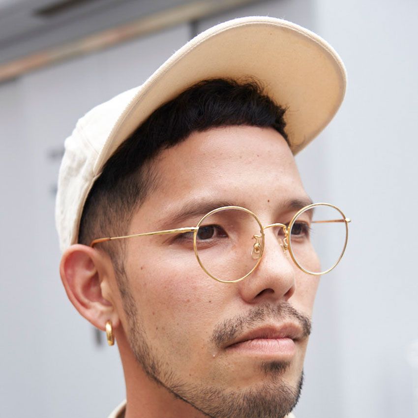 シャツ=マーティーアンドサンズ パンツ=ディガウェル シューズ=ビルケンシュトック 帽子=フォーティーセブン 眼鏡=アイヴァン 腕時計=ティファニー