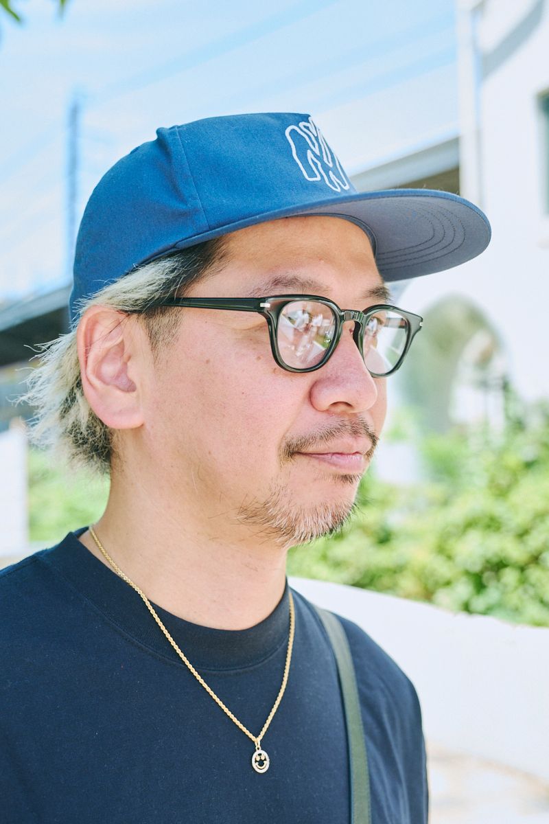 Tシャツ、パンツ=ともにエンノイ シューズ=ニューバランス 帽子=セーフハウス 眼鏡=ゾフ バッグ=ナイキ×シュプリーム 腕時計=カシオ ネックレス=アヴァランチ
