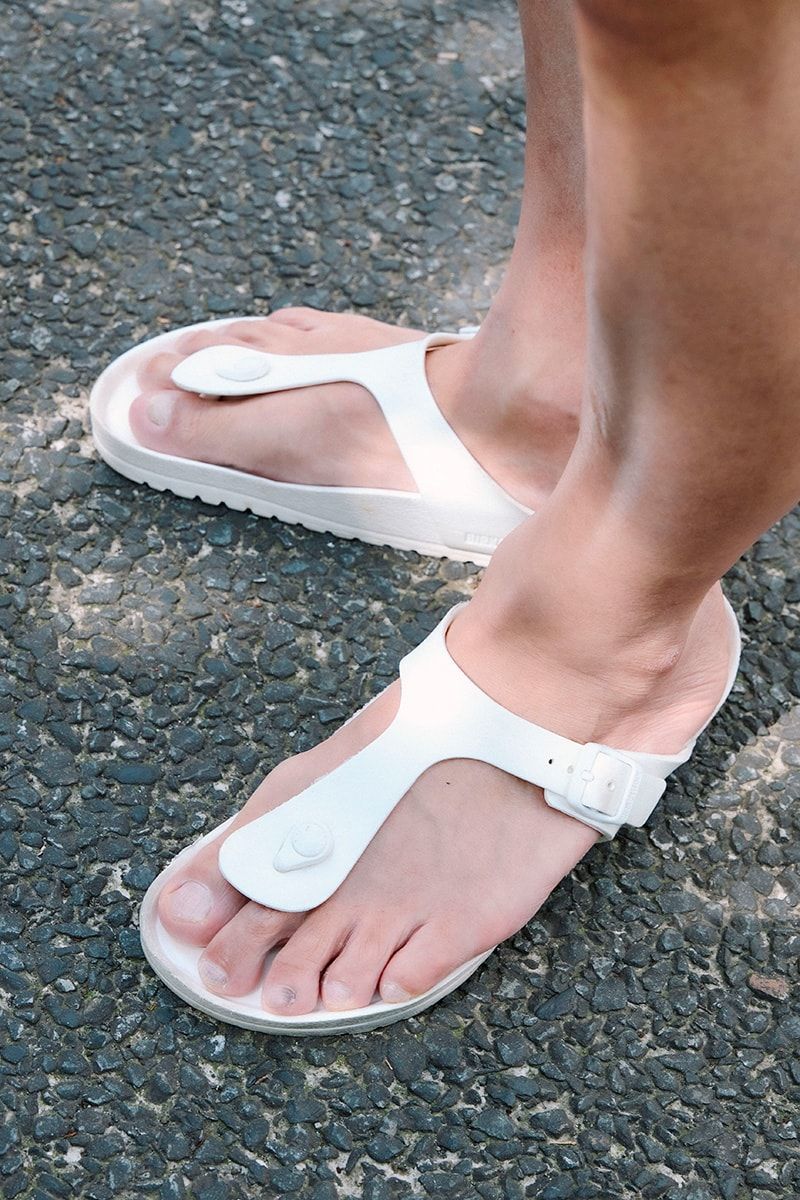 で、足元はビルケンシュトック。モデルは定番コルクサンダル、ギザのEVAモデルをチョイス。真っ白な一足は夏の日差しの下でよく映え、Tシャツ&短パンにちょっとした上品さを加える。
