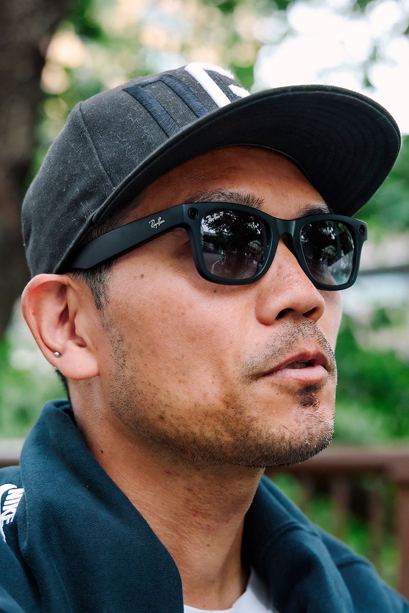 スウェット、ショーツ、スニーカー=すべてナイキ Tシャツ=チャンピオン 帽子=ニューエラ サングラス=レイバン 腕時計=アップル