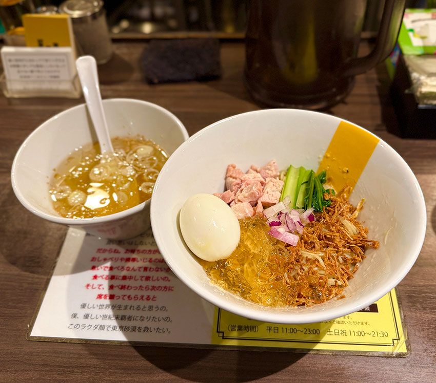 さらに、ジュレ状のスープや出汁氷といった冷製ラーメンならではの技巧が冴え渡り、温度帯の安定だけでなく、旨味のレイヤーを徐々に厚くしていく構成。“油そば”というジャンルの既成概念を解きほぐすような深みがそこにはあります。