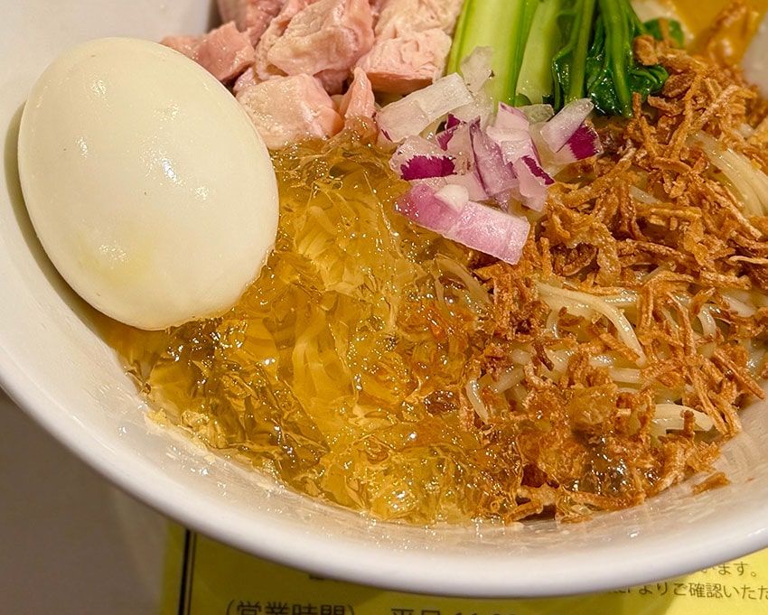 鶏の澄んだ清湯に輪郭の明確な塩ダレ、そして丁寧に擦り下ろされた生姜が融合し、じんわりと体温を押し上げてくる。そんな一杯が通常メニューとして提供されています。しかし、夏季限定の「冷たい油そば」もまた、非凡な完成度を誇る逸品です。