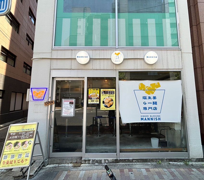 トップバッターは、2016年に創業し、2019年に現在の淡路町へ移転した、「塩生姜らー麺専門店 MANNISH 淡路町本店」。東京メトロ丸ノ内線の淡路町駅やJR神田駅からも徒歩5分ほどの立地。熊本県産の稀少な「きな生姜」を使用した、唯一無二の塩生姜らー麺を看板に掲げる人気店です。
