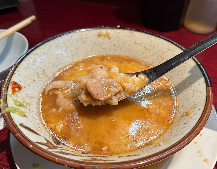 そして、冷やし肉めんの真骨頂ともいえるのが、締めの儀式。残ったスープに白ごはんを投入し、まるで冷製出汁茶漬けのようにフィニッシュを迎えるスタイルは、冷やし麺の常識を覆す満足感を与えてくれます。