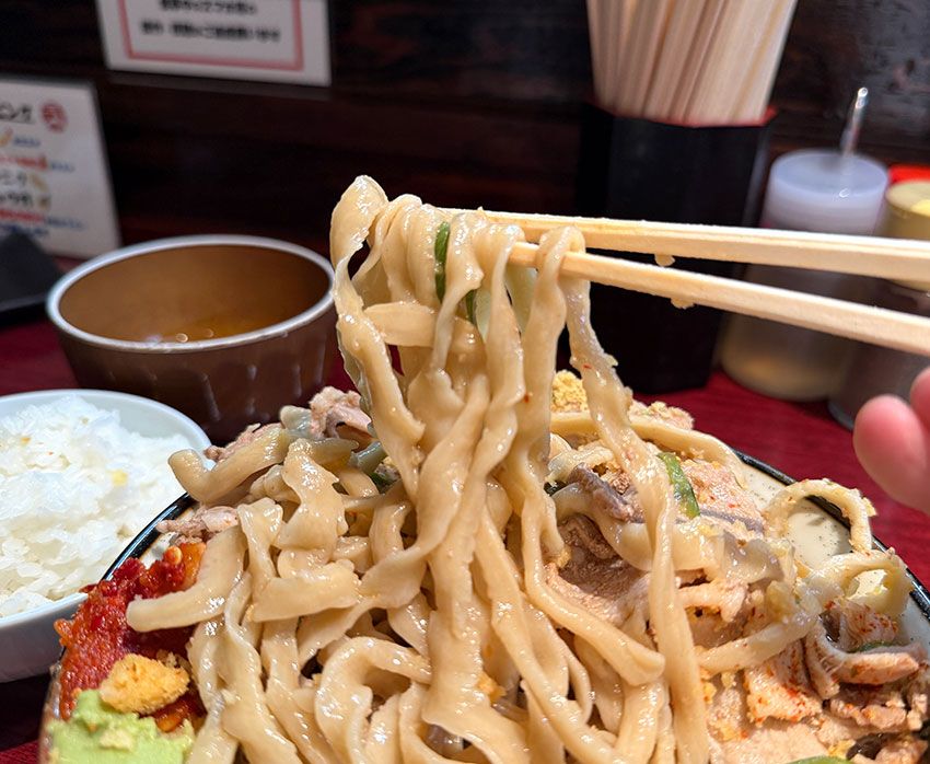 麺は平打ちの極太で、加水率高めながら二郎系ラーメンの麺によく使われる“オーション”を練り込んだ珍しいもの。氷水で締められてはいますが、適度な弾力を保ち、モチモチとした食感が楽しめます。スープとの相性も抜群。