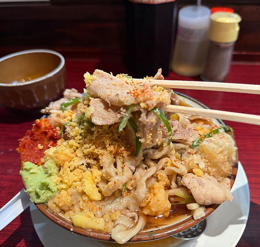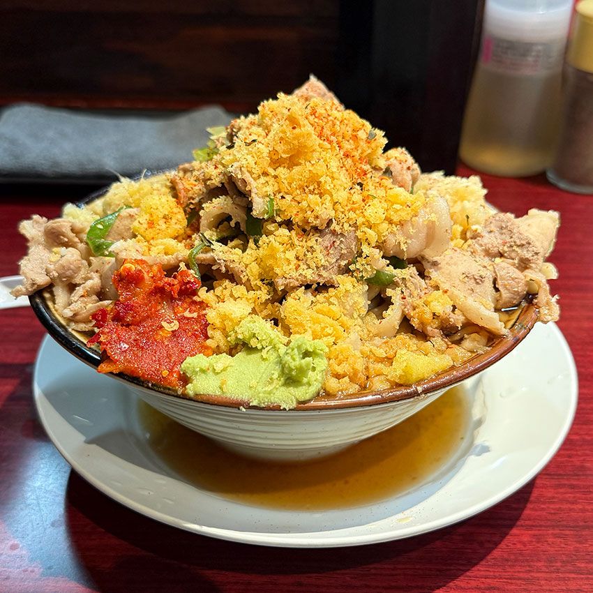 まず目を引くのは、丼を覆い尽くすほどの具材です。大判の豚肉に加え、カラミ・ニンニク・ショウガ・天かすが盛られたその姿は、まるで朝のラッシュアワーのような情報量を帯びており、視覚だけで食欲が刺激されます。