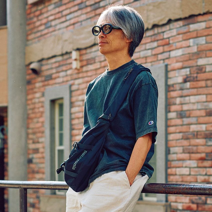 Tシャツ=チャンピオン パンツ=ハツキ スニーカー=ナイキ サングラス=白山眼鏡店 バッグ=パタゴニア