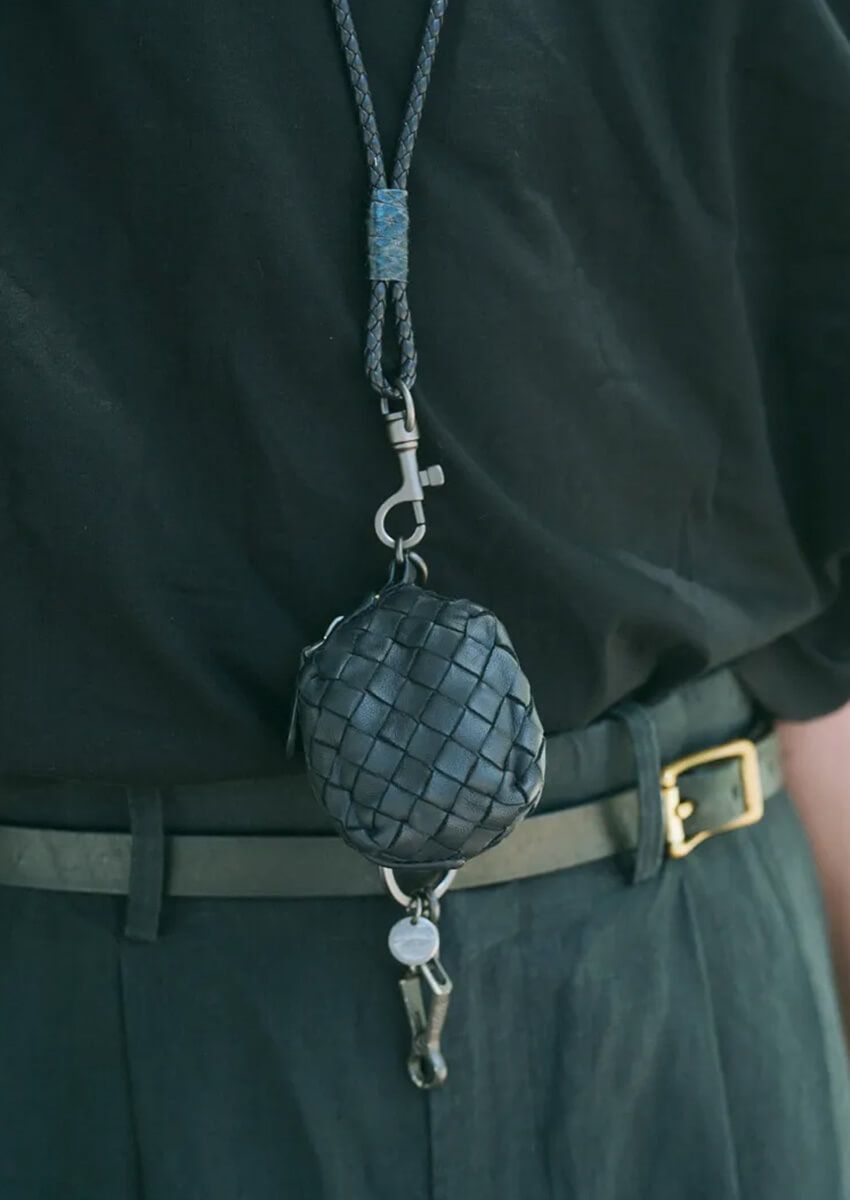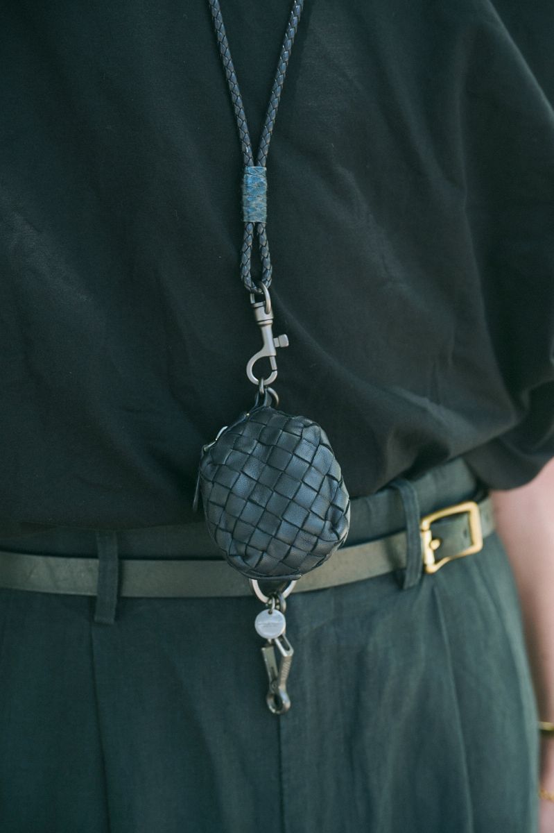 さらにタックインでウエストまわりにメリハリをつくり、ボッテガ ヴェネタのネックポーチでアクセントをプラス。センスの光るオールブラックである。